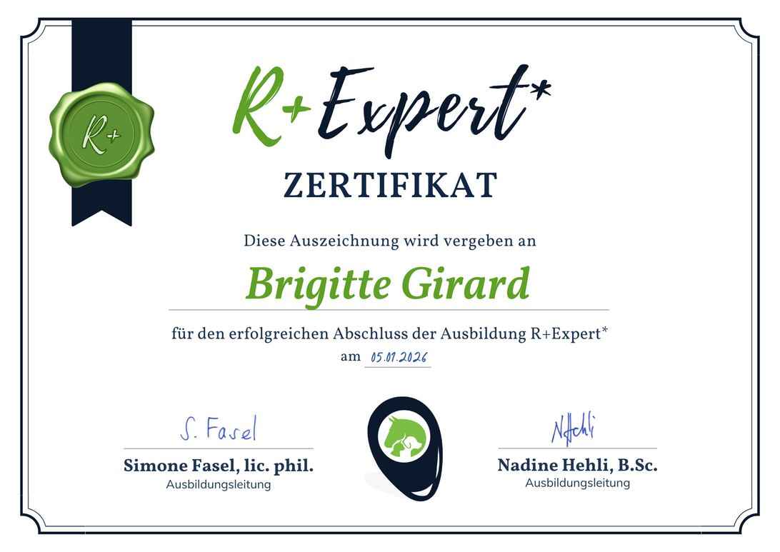 - 2023-26 R+Expert* Lehrgang, Expertin für belohnungsbasiertes Tiertraining (Nadine Hehli und Simone Fasel, Leben mit Hunden CH)